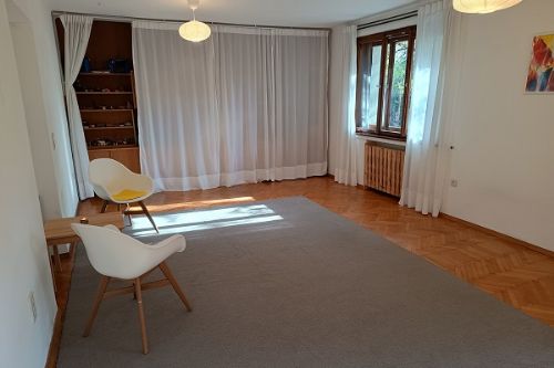 In der Regel nehmen die Klienten auf diesem Sessel Platz, auf Wunsch oder je nach Bedarf aber gerne auch in jeder anderen Richtung. Der Blick geht von diesem Sessel hinaus in den Garten.