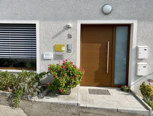 Der Praxiseingang befindet sich auf der Seite der Gartenanlage des Schlosses Holzheim.