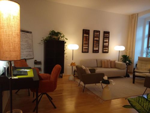 Praxisraum In meiner Praxis stehen zwei Räumlichkeiten zur Verfügung. In diesem finden die Gesprächssitzungen statt. Es gibt auch die Möglichkeit auf der Entspannungsliege Platz zu nehmen, falls einmal hohe Anspannung besteht oder Entspannungsübungen erarbeitet werden.