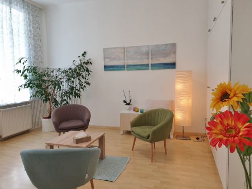 Gemütliche Praxis in Salzburg-Nonntal, geeignet für Einzeltherapie und Paartherapie. Gute Anbindung an Öffentliche Verkehrsmittel und Parkplätze in der näheren Umgebung.