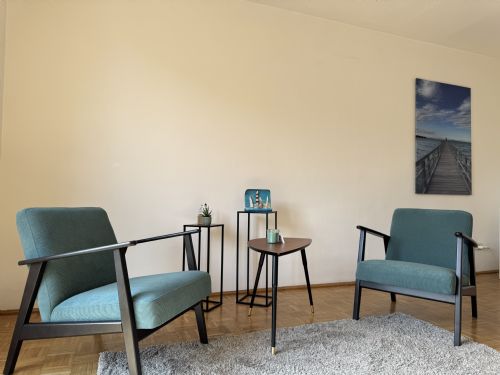 Praxisraum 2 ist für Einzeltherapie (Coaching, Supervision, Training), oder von der Personenzahl her, maximal für Paartherapie (Coaching) ausgelegt. Die Einrichtung ist speziell Hypnose-geeignet.