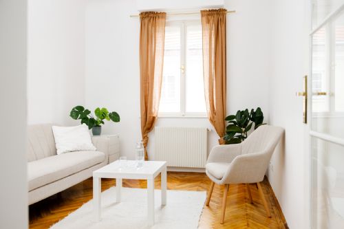 Couch und Sessel im Therapieraum. Hier findet der gemeinschaftliche Teil der Arbeit von Psychotherapeutin in Ausbildung unter Supervision Verica Mitrovic mit ihren Patient*innen statt.