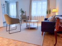 Blick in den freundlichen, lichtdurchfluteten Praxisraum mit gemütlicher Sitzecke.
